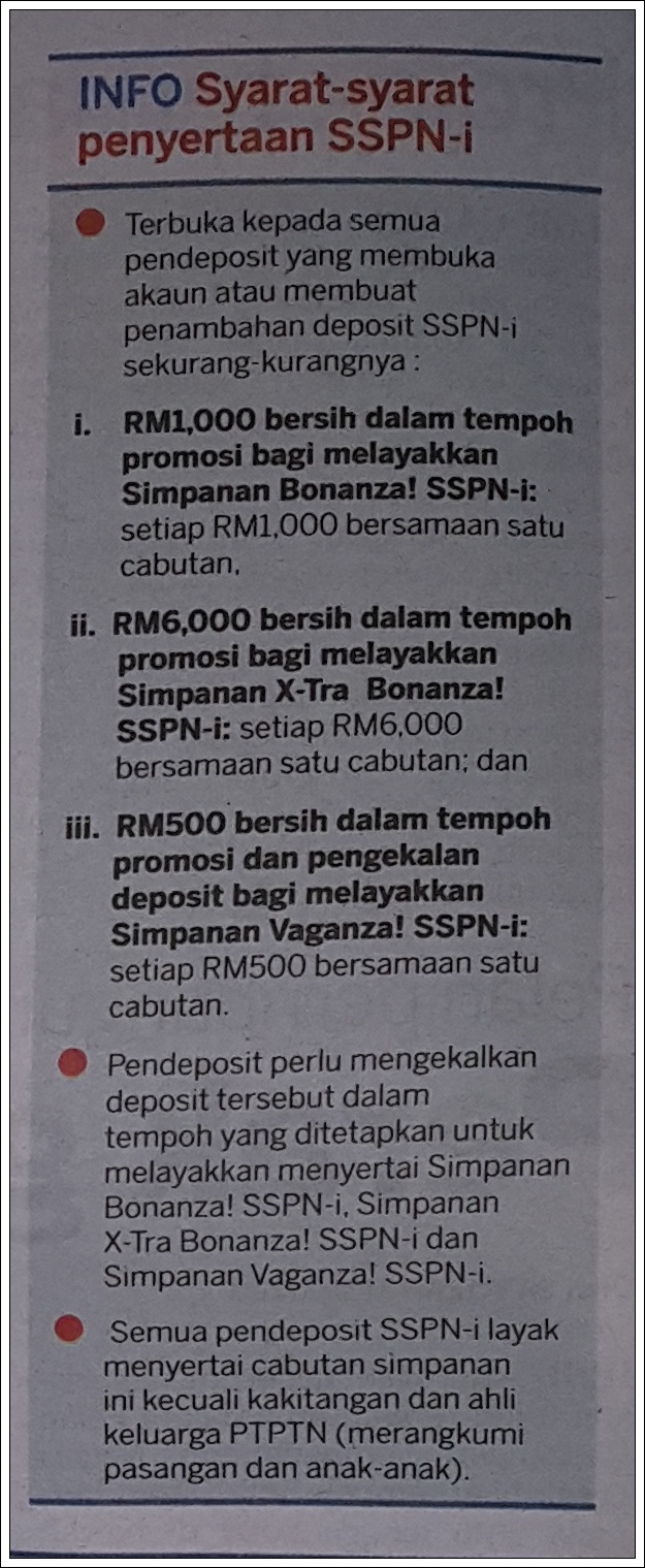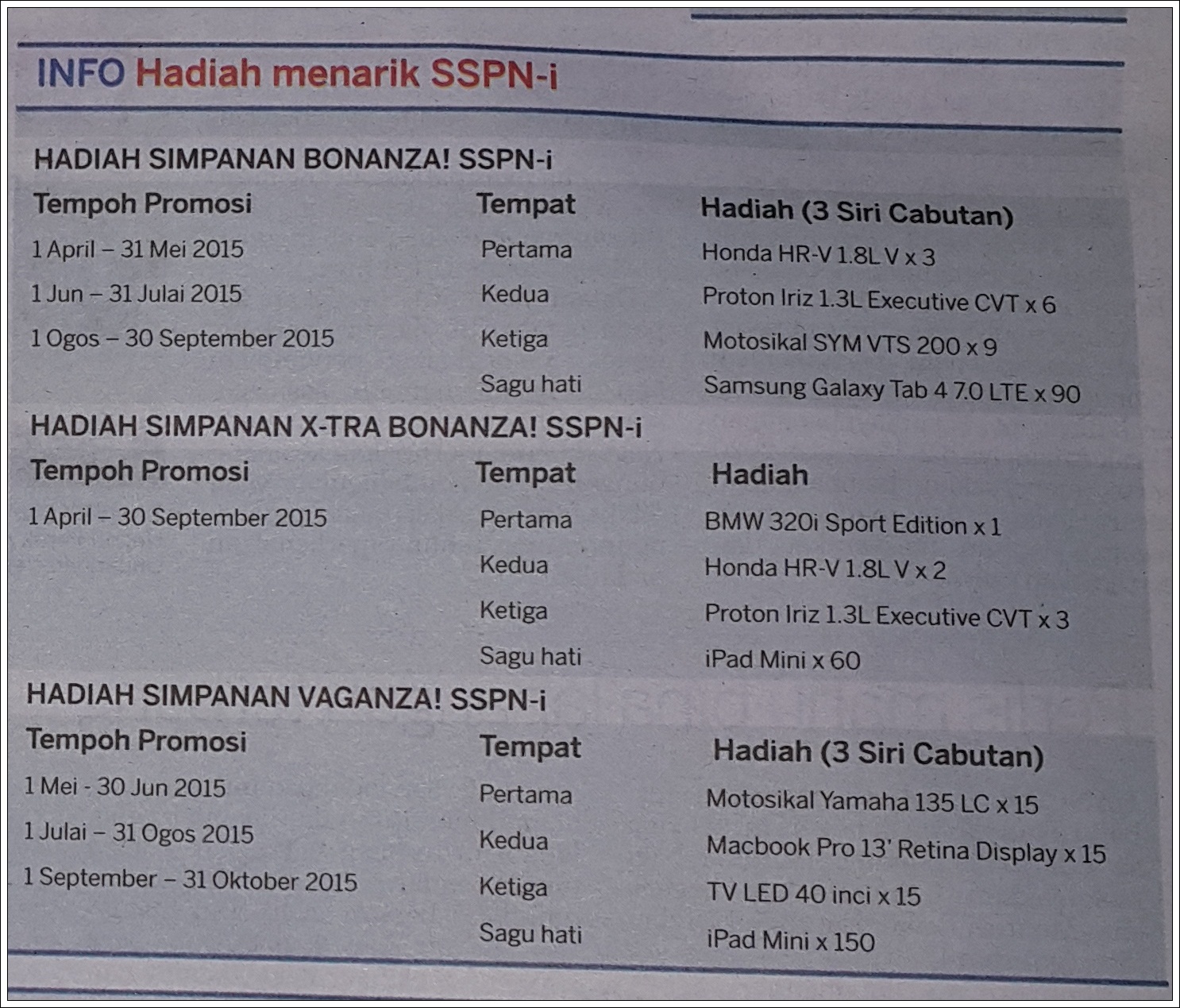 Bagi yang menyimpan di Skim Simpanan Pendidikan Nasional (SSPN-i)….anda berpeluang untuk memenangi hadiah menarik …jangn lepaskan peluang tau…mana tau anda antara yang bertuah…
