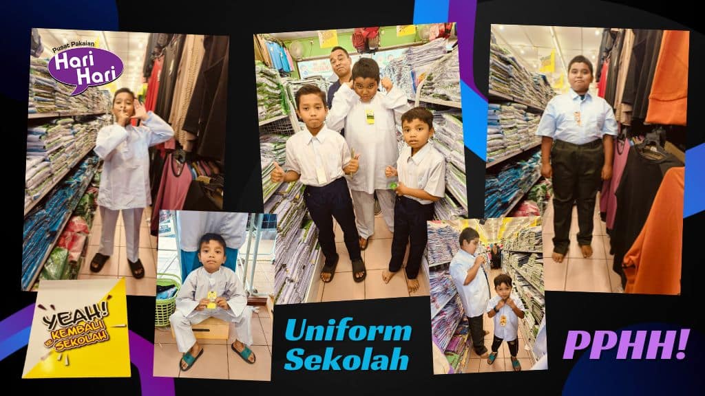 Pilihan Sal dan suami termasuk anak anak semestinya Pusat Pakaian Hari Hari – PPHH saban tahun . Pada Sal memang ramai yang pilih ke sini dan paling menonjol serta menjadi sebutan Ibu Ayah . Semua kelengkapan persekolahan ada dijual di sini . Buat apa nak stress pening kepala kan ?? Lagi pun mudah sangat dikunjungi sebab ia berada di mana mana (Negeri) sahaja