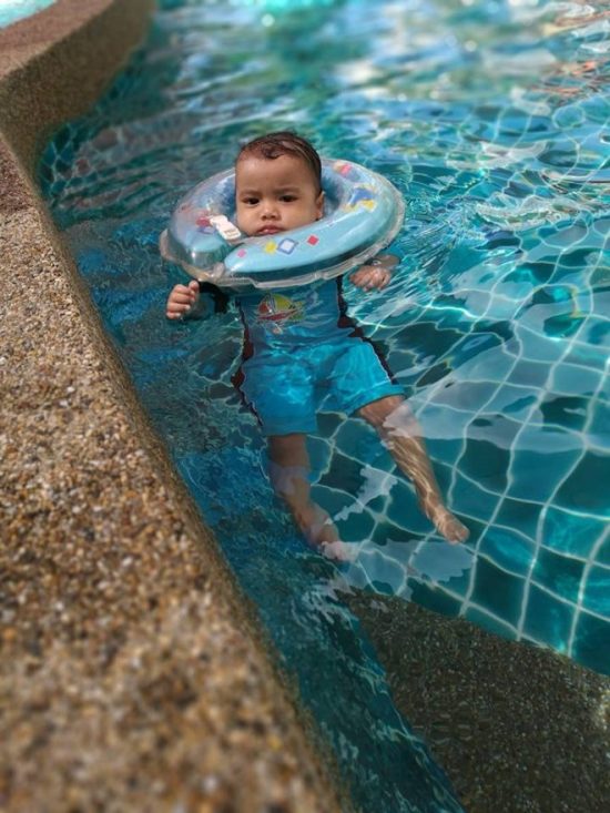 They so happy when go theme park. You little baby so smart as he does not scare of water.