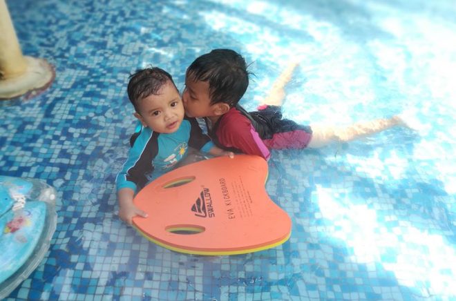 Kalini Sal memang fokus sikit pada Kaariz . Ingat takut air .. rupanya tak langsung . Lama jugakla dia dok dalam air dengan pelampung khas dia yang Sal beli sejak zaman Khalish baby lagi . Tahan betul . Bila ajak naik mengamuk lak dia .. penyudahnya Sal biar dia berendam dalam pool . Agak agak dia jauh ketengah , Sal mintak sape yang ada tolak dia ke tepi . Bila Mr Hubby ada , dia la dok jaga kejap . Selebihnya Sal perhati dari tepi pool .. boleh gitu ?? hehehe